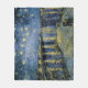 Thatched Cottages at Cordeville. Vincent Willem van Gogh. Night landscape in dark blue and yellow tones. There is a bridge across the river. In the foreground, a man and a woman are walking along the embankment. The stars are shining in the sky. Reproduction of famous works of art images in the public domain.