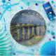 Thatched Cottages at Cordeville. Vincent Willem van Gogh. Night landscape in dark blue and yellow tones. There is a bridge across the river. In the foreground, a man and a woman are walking along the embankment. The stars are shining in the sky. Reproduction of famous works of art images in the public domain.