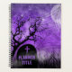 Starry purple magical night with full moon silhouette of gnarly dead tree, headstone, grass and several spiderwebs. Customize text on gravestone. Makes a great planner for young and old!