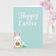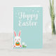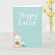 This card shows a calm spring scene on a muted teal background, with a festive Easter greeting placed across the upper half in soft white lettering with a faint shadow. Small five-point stars are scattered around the words, giving the space a light, airy lift 🌷. In the lower left corner, a fluffy white bunny with long ears stands facing forward, its inner ears tinted pink and its cheeks softly rosy 🐰. The bunny’s gentle gaze and relaxed posture suggest a sweet, affectionate mood, like it’s waiting to share a quiet moment with someone close. It holds a small woven basket in warm orange, and a teal bow tied to it echoes the background color for a cozy, coordinated look. Nearby, simple white daisy-like flowers with bright yellow centers bloom beside the bunny, adding a fresh garden touch. The bunny’s pink paw pads and the little teal bow stand out against the muted teal field, with tiny stars floating near the white greeting above.