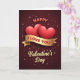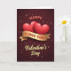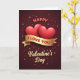 This greeting card shows two shiny deep-red hearts in the center, side by side, like they’re leaning into each other. A gold banner wraps around them and reads “I LOVE YOU” in red letters across the middle. The background is a dark maroon shade that makes the hearts and gold details stand out and feel cozy and romantic 💘. Near the top, the word “HAPPY” appears in coral-red letters with a raised, 3D look. Near the bottom, “Valentine’s Day” is written in gold cursive lettering that curves gently across the card. Small gold stars and tiny glitter-like dots are scattered around the background, adding a soft sparkle without taking attention away from the message ❤️.