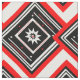 Here is a modern contemporary red, white and black fabric design in an abstract geometric pattern of rectangles, squares, lines and stars surrounded by a chevron motif.