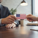 This professional business card from the Stars and Stripes collection features a bold, vertical American flag design on the front for a high-impact first impression. The back is designed with a clean, white minimalist layout that includes a traditional eagle icon and clear sections for your name, title, and contact details. It provides a balanced look that is both patriotic and functional, making it easy for clients and colleagues to find your information while recognizing your brand's core aesthetic.