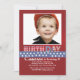 A delightful invitation with a patriotic theme. The bold red background has a blue, star-spangled band and custom "BIRTH DAY" wording. Just add your favorite photo to make it yours! (FP)