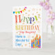 A colourful, text-based Birthday Card for a Step Daughter, with Polka Dot Bunting, bright, striped birthday cake candles and sprinkled with gold-effect stars. The patterned text says, 'Happy Birthday' and there is also 'Have a wonderful day!' in blue lettering (NB the gold effect stars and outlines will be as seen and not be printed in metallic ink.)