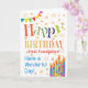 A colourful, text-based Birthday Card for a Great Grandfather, with Polka Dot Bunting, bright, striped birthday cake candles and sprinkled with gold-effect stars. The patterned text says, 'Happy Birthday' and there is also 'Have a wonderful day!' in blue lettering (NB the gold effect stars and outlines will be as seen and not be printed in metallic ink.)