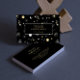 Space business card with a pattern of stars, galaxies, constellations, moons in white, silver gray, and pale golden yellow against a black background. The business card has elegant fonts in a gold color.