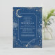 The navy blue invitation features a tranquil celestial design, adorned with distant galaxies, majestic planets, a graceful shooting star, and a delicate crescent moon. This template is designed to honor a loved one who always aspired to touch the heavens, liked stargazing, and found inspiration and joy beneath the wonders of a star-filled sky.