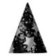 This party hat is shown in a black color with a print of fun silver stars all over it.