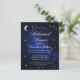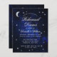 A budget rehearsal dinner invitation for a celestial wedding theme, with the moon and star on a starry night blue background. The title Rehearsal Dinner and the names are written in an elegant calligraphic script. The moon and the stars are faux silver foil, the text is white. On the black, there is only the moon and star on a starry night blue background.