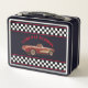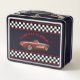 This lunchbox is adorned with a photo of a red Corvette. Above and below the photo there is a black and white checkered accent with red stripes. Lunchboxes are available in 7 colors, including stainless. The text can be customized.