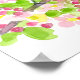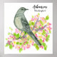 A poster decorated with a soft grey mockingbird perched on a branch of blooming pink apple blossoms illustrated with ink and painted with watercolor. Inspired by the state bird and state flower of Arkansas.