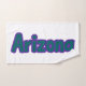 This custom hand towel features a design that displays the word "Arizona" in a Boldoa print font and purple colored letters turquoise outline in this custom state pride jersey style theme. This towel is made with a polyester blend front while the back is 100% cotton all towels will use sublimation/vibrant printing which is designed to last.