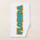 This custom hand towel features a design that displays the word "Florida" in a Luckiest Guy print font with aqua colored letters orange colored outline in this custom state pride jersey style theme. This towel is made with a polyester blend front while the back is 100% cotton all towels will use sublimation/vibrant printing which is designed to last.