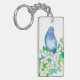 A keychain decorated with a mountain bluebird on a Syringa, mock orange, flowering bush painted with watercolor. The design is inspired by the state bird and state flower for Idaho.