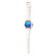 I only have one complaint. I ordered the watch with clear case and strap, and what was sent was white case and strap. I'm going to keep it because 1) it looks very nice in white, and 2) it would take too long to get a replacement made and sent in time for my occasion. Aside from the mix up with the color, the watch does look very good in white. The purple dial is actually sparkly which did not show in the online images. That was a nice surprise. If you like Swatch watches this is very similar to those. It's 33.6mm in diameter, 10.5mm thick, and 40.6mm lug to lug. Stainless steel case back says 3ATM/30m WR, so no swimming or showering or submerging this one. If you like Woodstock, this is a great choice.