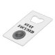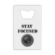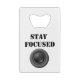 credit card bottle opener with lens and stay focused text