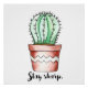 Poster features watercolor Potted Cactus with "Stay sharp" message in modern script font.