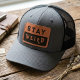 This leather patch hat is a tribute to creative, nonconformist, individualistic people who reject the status quo. It's "Stay Weird" is a message to embrace the unique, and reject the mundane. The word "Stay" is in a traditional font, with "Weird" in a slightly off-kilter font, with the leather color showing through a black background. This hat can be a badge of honor, a quiet rebellion for individualism and creativity.