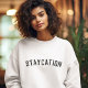 Simple, stylish "Staycation" custom quote art womens sweatshirt with modern, minimalist typography in black in a bold trendy style. The perfect gift or accessory for a vacation at home during the covid-19 coronavirus pandemic during periods of lockdown and travel restrictions.The words can easily be personalized with your own message for a gift as unique as you are!