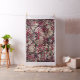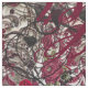 Overall pattern is a dense, collaged embroidery imprint with calligraphy quote fragments and photographic long stem rose overlays.