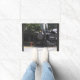 A door mat featuring a photo of a steam engine train.