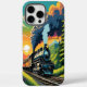 A steam engine chugs through a mountain landscape at sunset, leaving a trail of smoke and steam. Lush green trees surround the tracks, with distant mountains glowing in golden light