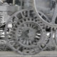 A photographic design of the wheels of a very early model of a steam train.