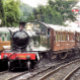 A beautifully restored steam train and carriages of a bygone era arriving at the train station.