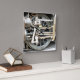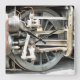 A photographic design of the wheel from a steam train.
