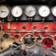 The steam train drivers view from the footplate of the gauges and controls of the train.