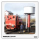 A beautifully restored steam train filling up with water from the water tank. A restored signal box is in the background.
