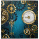 Turquoise, textured, steampunk background with brass and gold gears, a silver key and the clock. Steampunk style.
