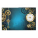Turquoise, textured, steampunk background with brass and gold gears, a silver key and the clock. Steampunk style.