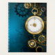 Turquoise, textured, steampunk background with brass and gold gears, a silver key and the clock. Steampunk style.