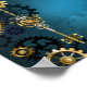 Turquoise, textured, steampunk background with brass and gold gears, a silver key and the clock. Steampunk style.