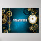 Turquoise, textured, steampunk background with brass and gold gears, a silver key and the clock. Steampunk style.