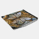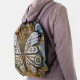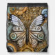 This is a steampunk styled drawstring bag featuring a butterfly with vintage clocks and the inside gears of clocks in shades of light blue and brown.