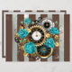 Patterned, antique watch, adorned with jewelry, gold hour hands and Latin numerals with turquoise roses on brown, striped background. Steampunk style.