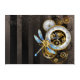 Antique dials with gold and brass gears, decorated with mechanical dragonfly on brown, striped background. Steampunk.