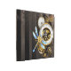 Antique dials with gold and brass gears, decorated with mechanical dragonfly on brown, striped background. Steampunk.