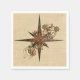 Rustic metal look design features a Steampunk style compass star with floral embellishments on vintage faux burlap background