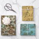 Wrapping paper sheets with steampunk designs. Three different colors and patterns cover these large sheets of gift wrap. Rusty gears over a distressed background, penny-farthing bicycles with big front wheels over sepia color, and blue paper with old maps and various gears are the three designs. The paper is perfect for a birthday, graduation or any special event celebrating with an old-fashioned theme.