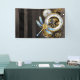 Antique dials with gold and brass gears, decorated with mechanical dragonfly on brown, striped background. Steampunk.