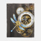 Antique dials with gold and brass gears, decorated with mechanical dragonfly on brown, striped background. Steampunk.