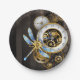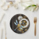 Antique dials with gold and brass gears, decorated with mechanical dragonfly on brown, striped background. Steampunk.