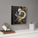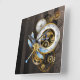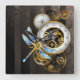 Antique dials with gold and brass gears, decorated with mechanical dragonfly on brown, striped background. Steampunk.