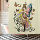 A blonde Steampunk fairy with pink and blue wings. The fairy is wearing cute outfit with a top hat, corset and striped stockings, Butterflies, clock, gears and tribal design all in a background of light yellow