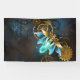 Steampunk firefly with blue transparent wings and green light bulb on worn, brown, textured background. Steampunk style.