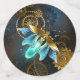 Steampunk firefly with blue transparent wings and green light bulb on worn, brown, textured background. Steampunk style.